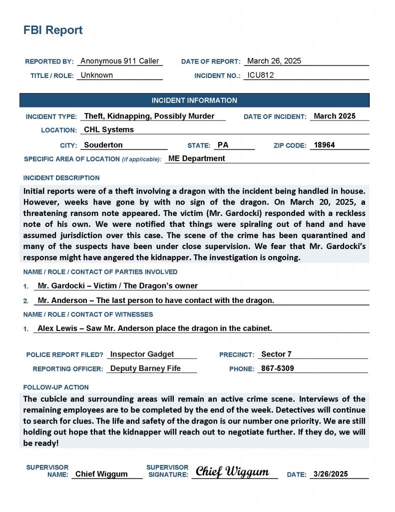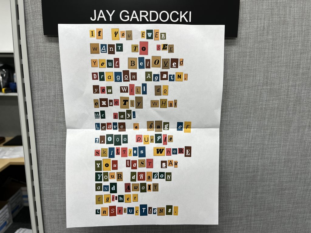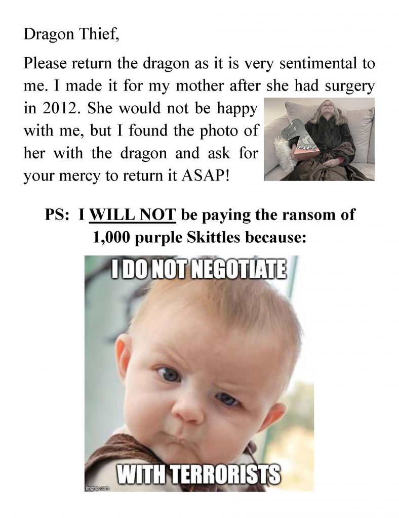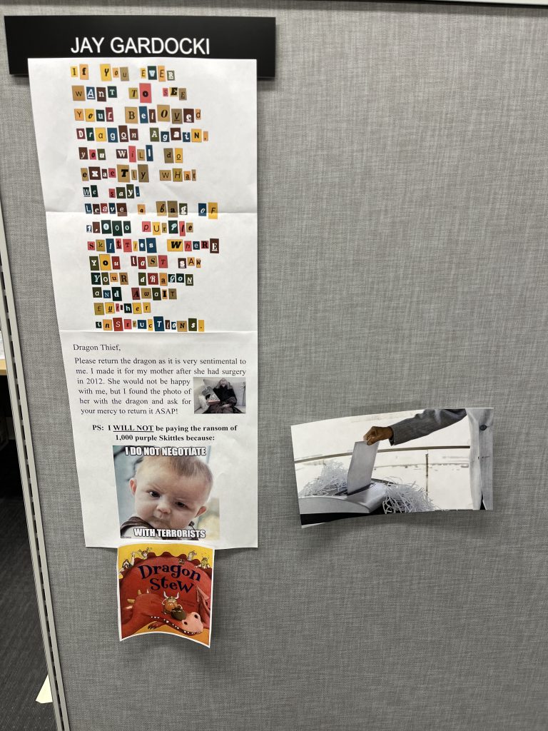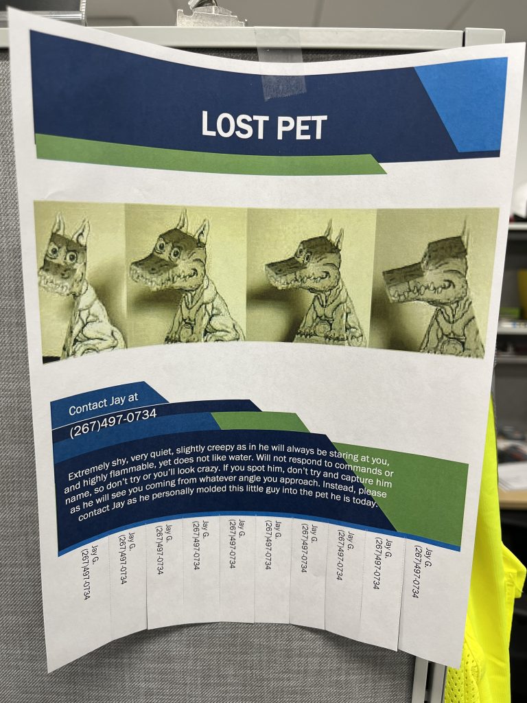 I secretly took the dragon home, and then I waited. A week later, Dave Anderson confessed that he took the dragon, but it was no longer where he left it. I then made up the story that the dragon was sentimental and that I needed it returned. A day later, I told purchasing about the dragon hoping that there would be backlash. John Davis went above and beyond and The Lost Pet flyer appeared.